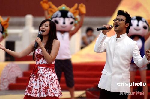 8月6日上午,奥运火炬传递北京站从午门正式开始传递。图为张靓颖、汪峰在传递现场放歌。中新社发 王东明 摄