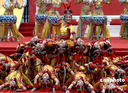 8月6日上午,奥运火炬北京站传递从午门正式开始。图为精彩文艺表演为火炬传递助阵。 中新社发 王东明 摄