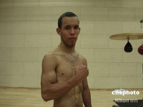 8月5日,美国拳击队在北京师范大学训练营进行奥运会前的公开训练。图为夺金热门拳手美国的路易斯·扬耐兹正展示自己的肌肉。他也是中国选手邹市明夺金道路上最大的拦路虎。中新社发 赖松 摄
