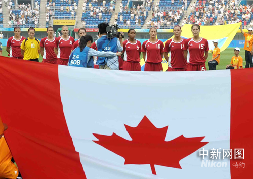 8月6日下午,奥运女足在天津“水滴”体育场拉开战幕,首场比赛阿根廷女足迎战加拿大。图为加拿大女足出场仪式。 中新社发 陈文 摄