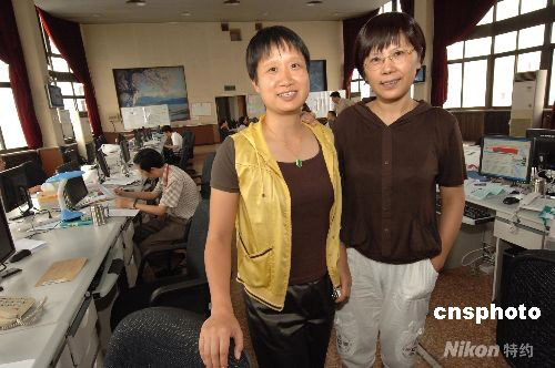 8月6日,在1988年(第24届)汉城奥运会上,为中国夺得该届第一枚金牌的女子跳水运动员许艳梅(左),做客中国新闻社,与体育部参加北京奥运会采访的知名记者王祖敏(右)在奥运报道大厅合影留念。 中新社发 邹宪 摄