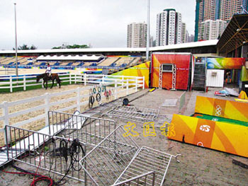 台风“北冕”把香港奥运马术沙田主场地旁的记者区装饰物,吹得东倒西歪。(图片来源:文汇报)