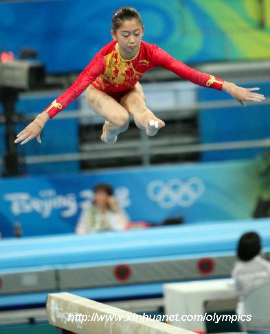 8月7日,中国女子体操队在国家体育馆进行赛台训练。 新华社记者林慧摄