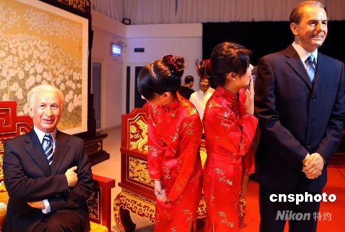 图为礼仪小姐观赏“萨马兰奇”、“罗格”蜡像。