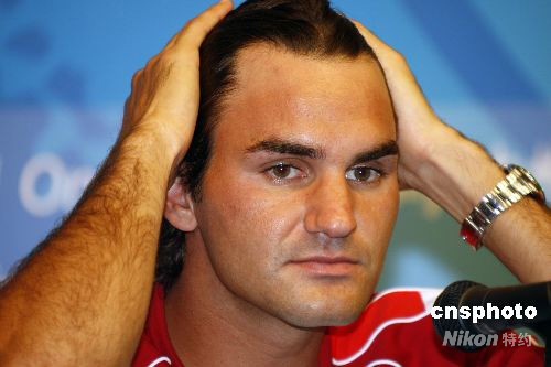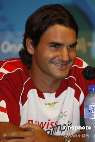 8月7日,瑞士网球天王罗杰·费德勒在北京奥运新闻中心召开发布会。费德勒将在8月8日开幕式当天度过自己27岁生日。 中新社发 杜洋 摄