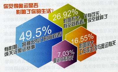“你觉得奥运是否影响了你的生活?”问卷调查结果显示,66.05%的受调查者认为有影响或影响较大。其中表示“有影响,将抽出专门时间观看或关注奥运赛事”的占受调查者49.5%(2228票),表示“影响很大,工作或生活与奥运有关”的占受调查者16.55%(745票)。