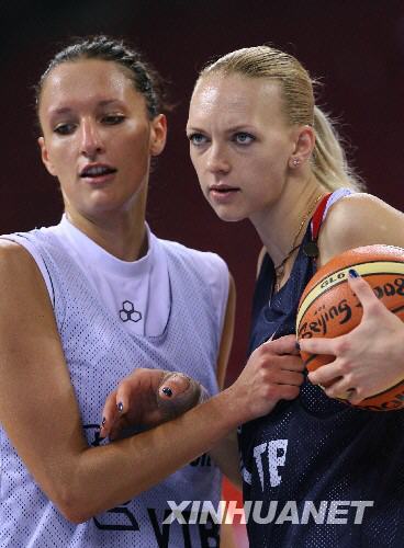 8月7日,俄罗斯队球员奥西波娃(右)在训练中。新华社记者孟永民摄