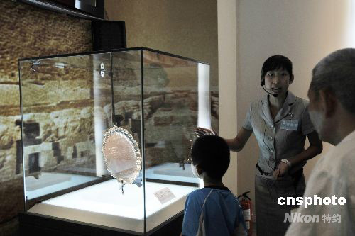 8月7日,北京奥运重要文化项目《世界瑰宝——中华人民共和国国际礼品展》在中国人民革命军事博物馆开幕。据悉,此次的国际礼品展堪称中国国礼最全面的一次公开亮相。图为讲解员为参观者介绍1963年阿拉伯联合共和国苏伊士运河管理局赠中国国务院总理周恩来的“银刻字花边圆盘”。中新社发 王宇婷 摄