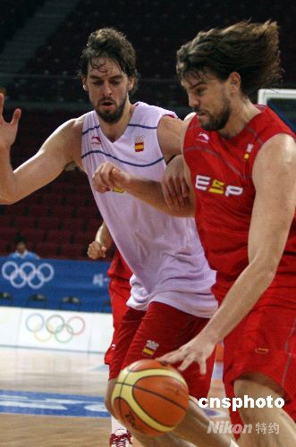 8月7日,世界冠军西班牙男篮在北京奥运会篮球比赛馆——五棵松篮球进行赛前的最后一场热身训练,效力于NBA洛杉矶湖人队的超级球星保罗·加索尔(左)与弟弟马克·加索尔率领球队演练战术。中新社发 任晨鸣 摄
