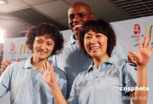 8月7日,在北京奥林匹克公园举行了传统的“巨无霸制作大赛”,并为比赛的优胜者颁发“奖牌”。美国9枚奥运短跑金牌得主卡尔·刘易斯、中国奥运冠军王军霞、高敏,与麦当劳全球奥运团队成员等一起,共同参加了巨无霸汉堡制作大赛。图为王军霞(右一)、高敏(左一)与卡尔·刘易斯出席“麦当劳巨无霸制作大赛”。 中新社发 钱兴强 摄