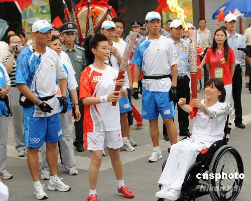 8月7日,奥运圣火继续在北京传递,桑兰坐着轮椅用辅助手臂与宋祖英交接火炬。她们是8月7日传递的最后两棒火炬手。 中新社发 廖攀 摄