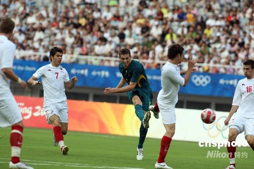 8月7日,北京奥运会男子足球预赛A组,澳大利亚对塞尔维亚的比赛在上海体育场进行。最终,澳大利亚1:1战平塞尔维亚,双方握手言和。图为澳大利亚5号选手SPIRANOVIC Matthew在多位防守队员包围下起脚射门。中新社发 汤彦俊 摄