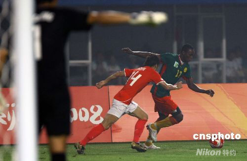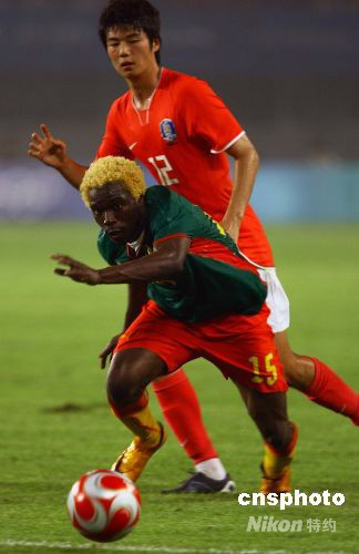 图为韩国队14号柏志勋与喀麦隆队17号阿兰·奥莱在比赛中争抢。