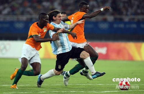 8月7日,北京奥运会上海足球分赛场男足预赛,在卫冕冠军阿根廷对阵科特迪瓦的比赛中, 阿根廷以2:1取胜迎来开门红,球星梅西(MESSI Lionel)为阿根廷攻入本届奥足赛首粒进球。图为梅西带球从人缝中突破。 中新社发 汤彦俊 摄