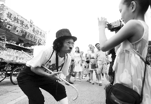 黑礼帽,肥裤子,小拐棍噌的一斜,45岁的李凯为在大街上拉开了架势。“呀,卓别林都搞来迎奥运了”,路边传来一阵惊呼。“卓别林”拐棍一转,又一个经典姿势引来一阵快门声。