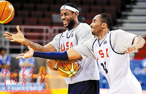 8月7日,科比(右)和詹姆斯在训练中抢球。当日,美国男篮在五棵松奥运篮球馆备战8月10日与中国队的比赛。 刘占坤摄