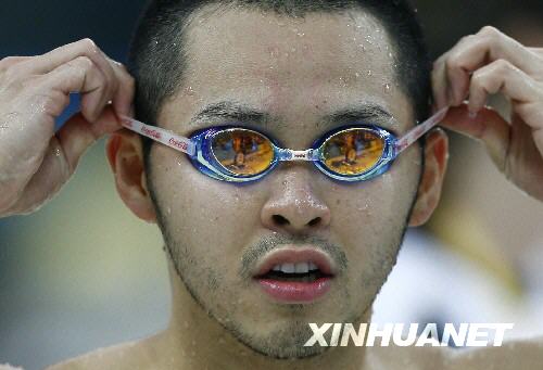 8月7日,日本游泳名将北岛康介在下水前整理泳镜。新华社记者丁旭摄