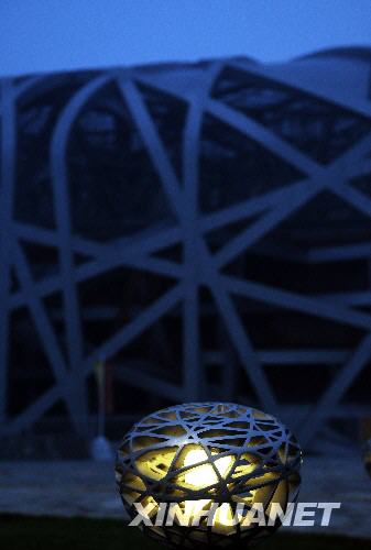 8月8日5时许,国家体育场“鸟巢”与“鸟巢”造型景观灯相映成趣。此刻距北京奥运会开幕还有15个小时。 新华社记者王庆钦摄