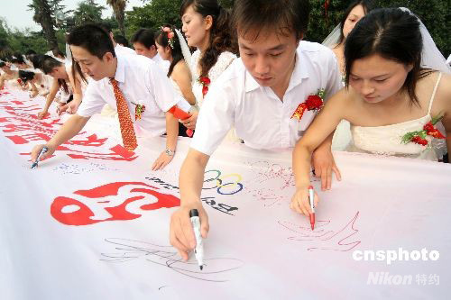 8月7日,河南许昌举行“情缘奥运”大型集体婚礼,28对新人在西湖公园喜结良缘,近千余名观众见证与分享了他们的幸福和快乐。中新社发 牛书培 摄