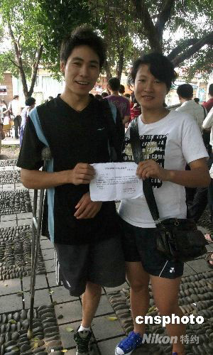 8月8日,重庆市渝中区婚姻登记处外,曾参加过中国残疾人运动会的田径运动员王丽娜(右)和羽毛球运动员程良华(左)正在等候办理婚姻登记手续。 中新社发 周阳 摄