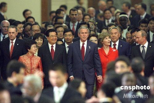 8月8日,中国国家主席胡锦涛在北京人民大会堂宴会厅为出席北京奥运会的贵宾举行欢迎宴会。图为国际奥委会主席罗格、胡锦涛夫妇、美国总统布什夫妇、俄罗斯总理普京(左至右)等一起步入宴会厅。中新社发 廖文静 摄