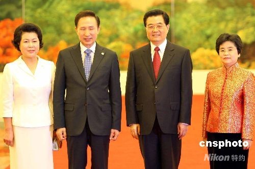 图:胡锦涛夫妇欢迎韩国总统李明博夫妇