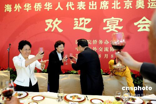 8月8日,中国国务院侨务办公室在北京钓鱼台国宾馆举行宴会,欢迎出席北京奥运开幕式的近200位华人华侨代表。中新社发 廖攀 摄