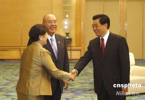 8月8日,中共中央总书记胡锦涛在北京会见中国国民党主席吴伯雄。中新社发 盛佳鹏 摄