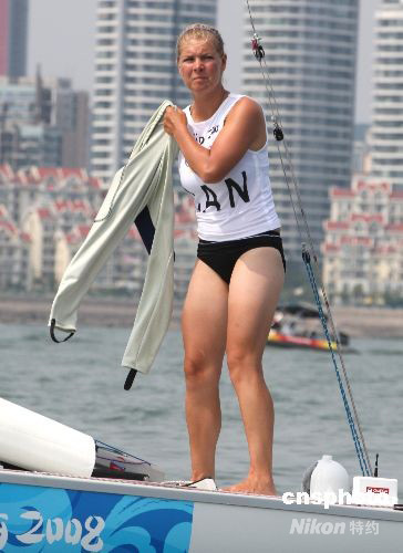 8月8日青岛天气晴朗,骄阳似火,众多选手抓紧时间进行训练。图为加拿大帆船选手训练归来途中在船上“更衣”。 中新社发 赵振清 摄