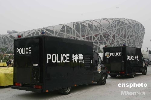 图:北京奥运即将揭幕 特警车辆场外戒备