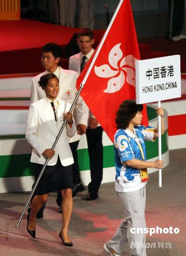 八月八日,香港特区政府在沙田赛场举行盛大欢迎晚会上,欢迎来自世界各地参加奥运马术比赛的参赛队伍。图为香港队入场。 中新社发 洪少葵 摄