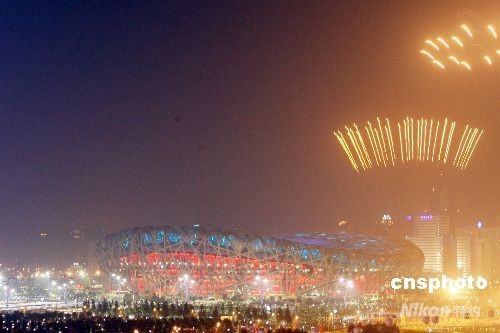 8月8日晚,第29届奥林匹克运动会在北京开幕。象征脚印的焰火“走”进鸟巢。中新社发 毛建军 摄