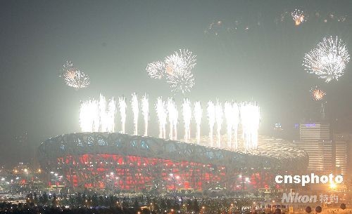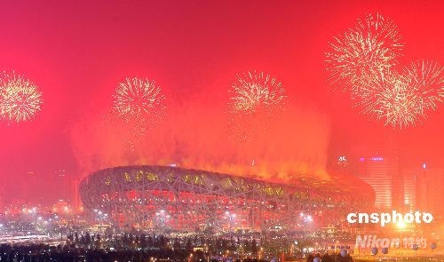 八月八日晚,第二十九届奥林匹克运动会在北京开幕,烟花映红北京夜空。中新社发 毛建军 摄