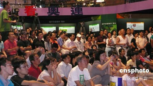 八月八日,举世瞩目的北京奥运会壮丽登场,成千上万的台湾民众在家中、餐馆或街头大屏幕下,准时收看晚八时零八分开始的奥运开幕式。有媒体形容这是一场“视听飨宴”。图为台北市京华城购物中心内,民众席地而坐观看开幕演出。中新社发 曾嘉 摄