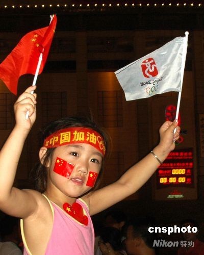 8月8日晚8时,北京天安门广场东侧奥运倒计时牌归零。在天安门广场为北京奥运狂欢的一位小女孩拿着中国国旗为北京奥运加油。中新社发 张双双 摄