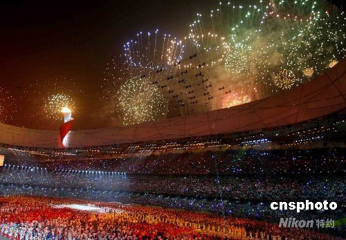 图:"五环烟花"映衬下奥运主火炬熊熊燃烧
