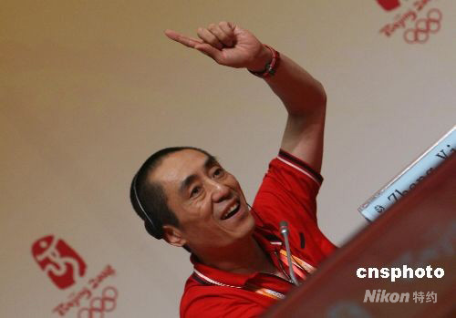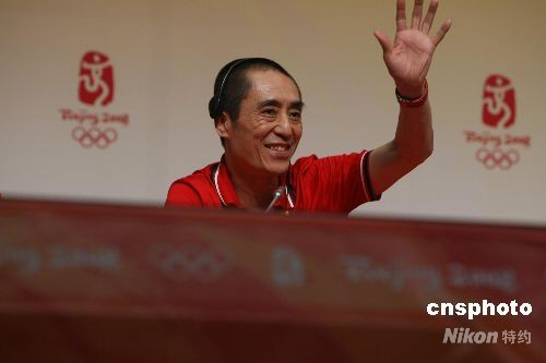8月9日凌晨,北京奥运会开幕式创作团队在北京奥林匹克公园主新闻中心就开幕式等相关问题答记者问。图为总导演张艺谋笑答记者提问。 中新社发 武仲林 摄