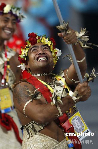 图:基里巴斯代表团旗手身着民族服装入场