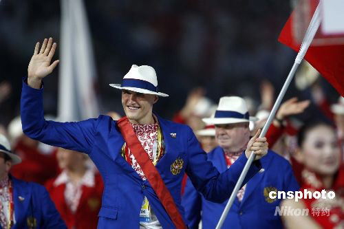 图为俄罗斯代表团的旗手篮球运动员基里连科。中新社发 杜洋 摄