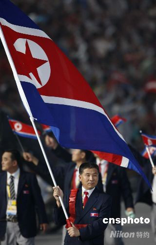 图为朝鲜奥运代表团旗手。中新社发 杜洋 摄