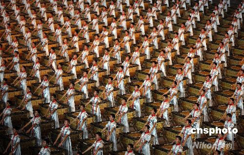第二十九届夏季奥运会8月8日晚在北京奥林匹克公园内的国家体育场举行开幕式,由一千多面“战鼓”组成的盛大阵容欢迎各地嘉宾。中新社发 任晨鸣 摄