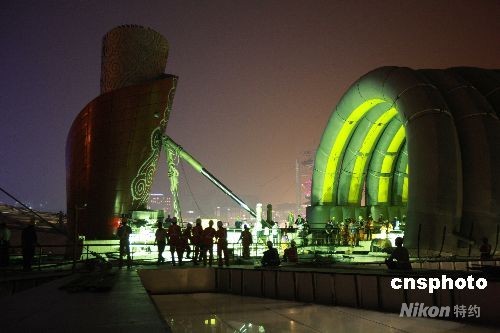 图为7月23日深夜,鸟巢顶上的奥运火炬通过液压自行系统缓缓“走”出气房子,准备进行第一次试点火。中新社发 佟伟 摄