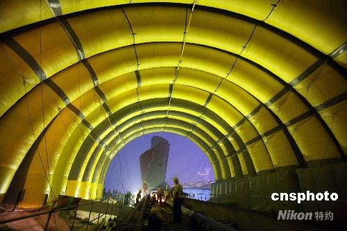 图为7月23日深夜,鸟巢顶上的奥运火炬塔缓缓走出高度保密的气房子,准备进行第一次试点火。中新社发 佟伟 摄