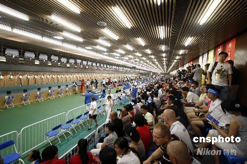 北京奥运会射击男子10米气手枪资格赛在北京射击馆举行,参赛的中国选手庞伟晋级决赛,老将谭宗亮发挥欠佳惨遭淘汰。图为观众在赛场内观看比赛。中新社发 盛佳鹏 摄