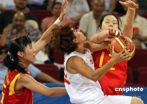 8月9日下午,中国女篮在北京奥运会篮球馆--五棵松体育馆举行的小组赛首场比赛中,以67比64险胜西班牙队。图为中国队12号陈晓丽(右)与15号陈楠联手封盖西班牙队9号PALAU Lais的上篮。中新社发 任晨鸣 摄
