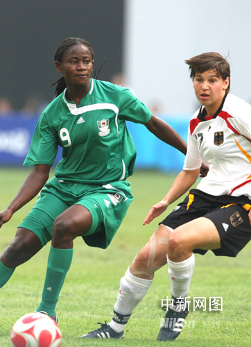 8月9日,奥运德国女足对阵尼日利亚队。图为两队在激烈争抢。中新社记者 张宇 摄