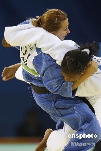 8月9日,北京奥运会柔道比赛在北京科技大学体育馆拉开战幕。在女子柔道48公斤级的决赛中,世界排名第一的罗马尼亚选手杜米特鲁轻松战胜古巴选手贝尔摩尼特,夺得本届奥运会柔道比赛的首枚金牌。中新社发 盛佳鹏 摄