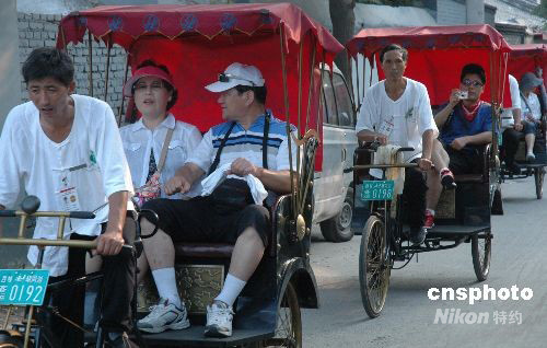 图为8月9日北京后海附近的胡同里坐三轮车游览的中外游客络绎不绝。 中新社发 王辛莉 摄