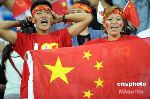 8月9日晚,中国女足在天津奥体中心水滴体育场与加拿大女足进行奥运第二场小组赛的较量,球迷在比赛现场为奥运会女足比赛加油。 中新社发 陈文 摄
