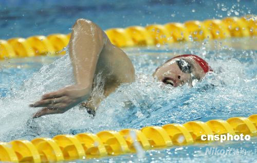 图:中国选手张琳在男子400米自由泳预赛中